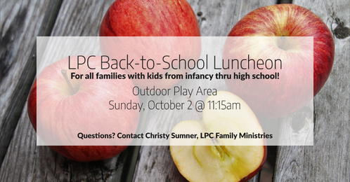 Join us for a back-to-school celebration lunch in the outdoor play area. Food and drinks will be provided. Come get to know other parents, let the kids play, and learn about opportunities for involvement in the life of the church.